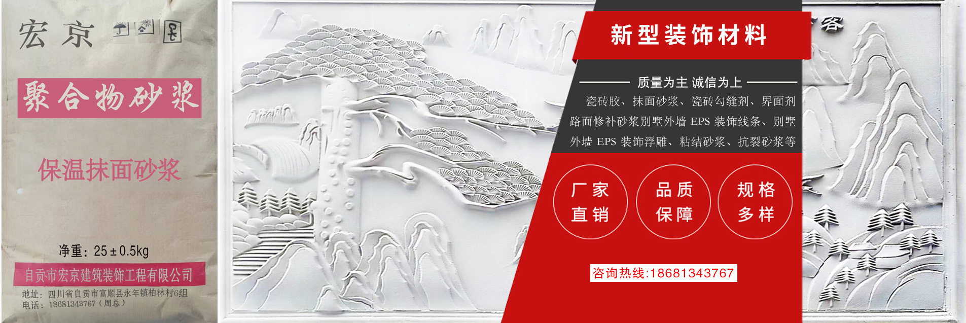 自貢市宏京建筑裝飾工程有限公司,成立于 2018 年,廠房位于位于四川省自貢市富順縣永年鎮柏林村 6 組柏林村小。本公司集保溫材料聚合物改性水泥基砂漿材料研發(fā)、生產、銷售于一體的干粉砂漿材料公司。 公司基于低碳、環(huán)保、綠色、節(jié)能的經營理念,生產推廣高效、節(jié)能、環(huán)保的新型保溫材料等產品。本公司 產品具有質量優(yōu)良、良好技術、精湛工藝、成本低等優(yōu)勢。公司成立以來,一直視產品質量為企業(yè)的生命, 堅持“質量為先,顧客至上”的服務宗旨,贏得了客戶的信賴,并建立了完善的售前售后服務體系,歡迎各 界來